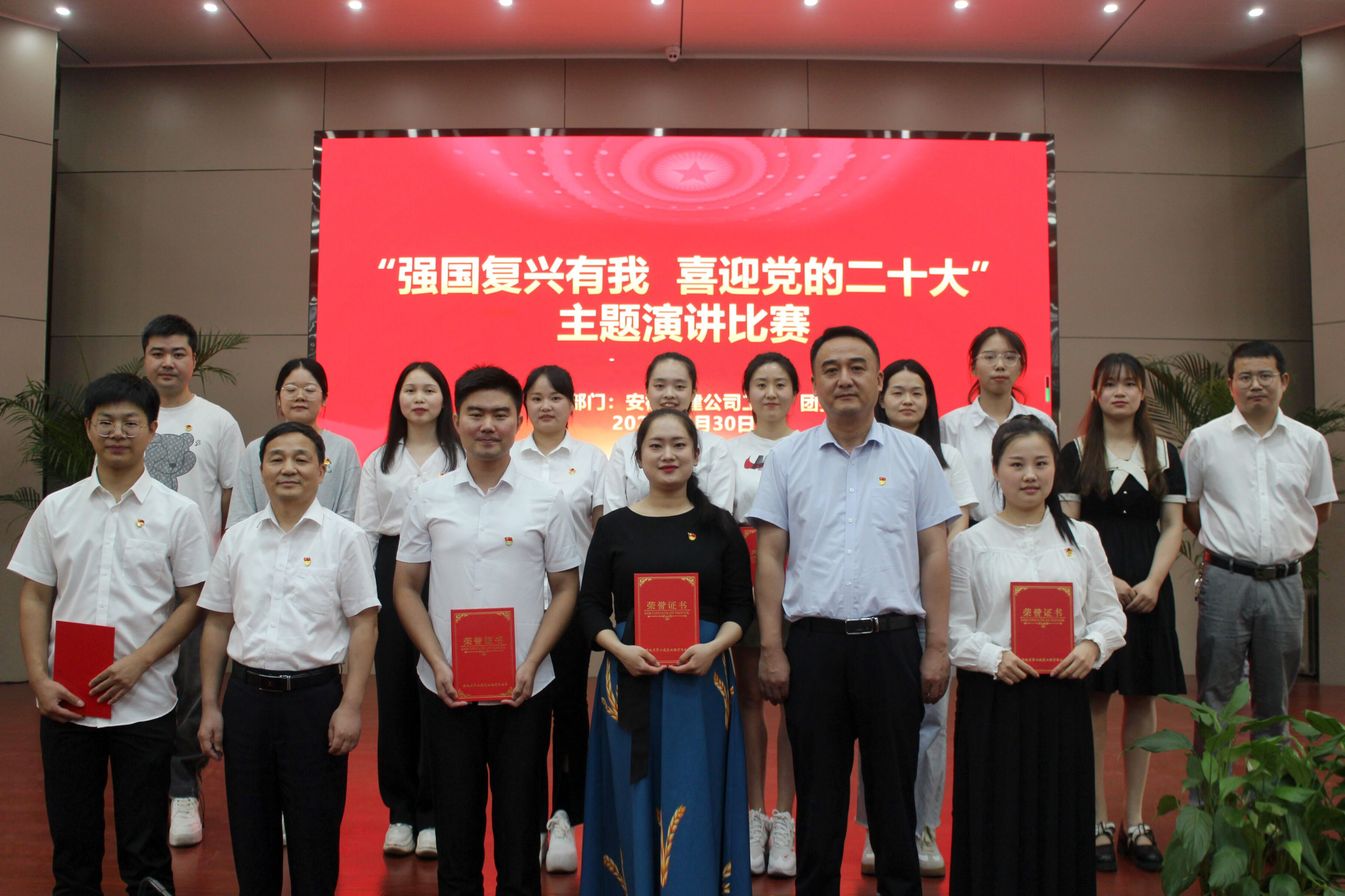红旗飘飘,歌声嘹亮,金秋十月,又添新喜。为庆祝中华人民共和国成立73周年,喜迎党的二十大胜利召开,9月30日下午,安徽二建公司工会、团委在新会议室举办“强国复兴有我 喜迎党的二十大”主题演讲比赛。公司党委副书记、总经理李建成,党委副书记、工会主席王军,党委委员、纪委书记沈壮,党群部门人员,所属单位党支部、工会、团支部负责人,部分职工代表现场观看比赛。