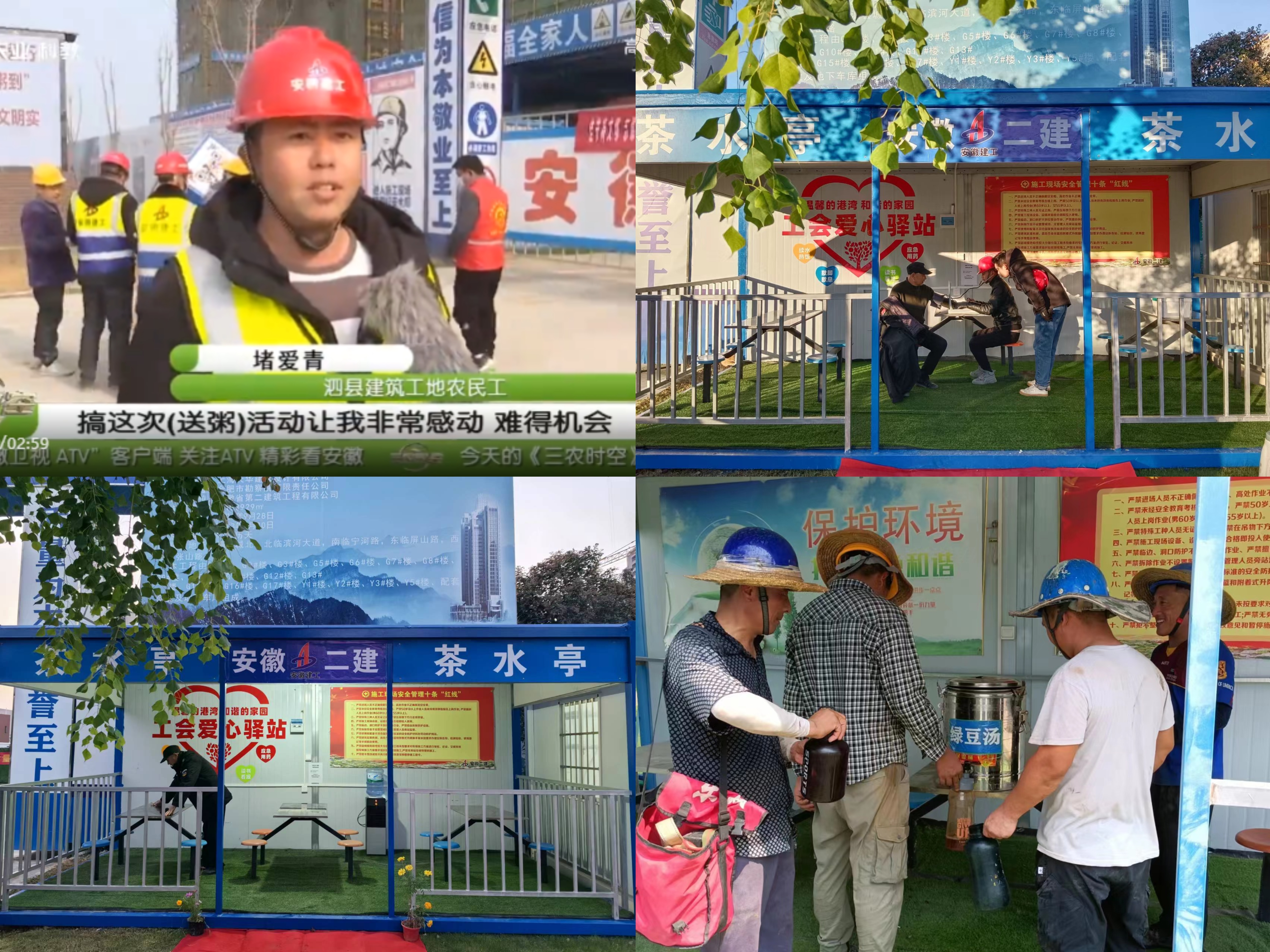 泗县多金城项目“工会驿站”建设面积约40平方米,自开工以来,为方便一线工友就餐、休息,设立了茶水亭、休息室等“工会驿站”,并配备了纯净水、防暑降温和外伤应急药品、血压测量仪、充电设施、免费WiFi、阅读室等。通过定期组织免费体检、防暑降温药品和饮品发放、“腊八节”送粥等公益服务活动,为一线员工提供了一个温馨的休憩港湾。