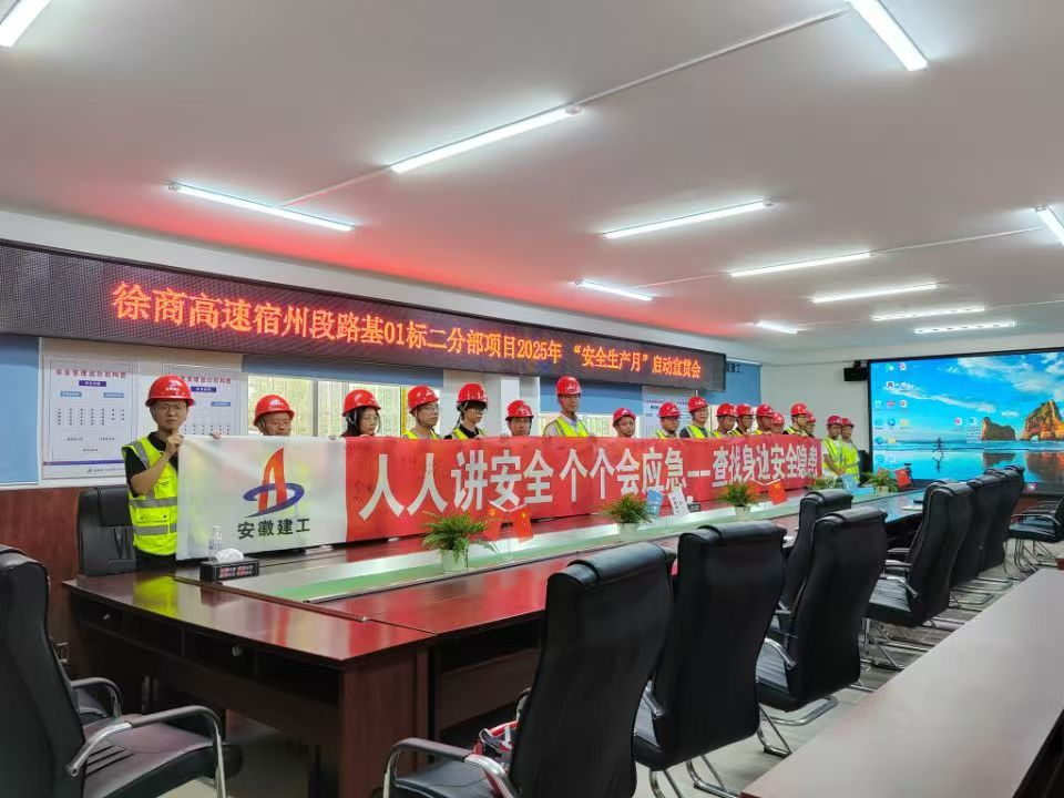 为进一步强化安全生产意识,落实安全生产责任,确保工程建设期间的人员安全和工程质量,近日,S02徐商高速宿州段路基一标二分部在项目驻地举行了2025年“安全生产月”启动仪式。