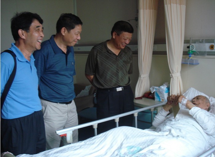 图为公司党委书记朱治淮(右一)、工会主席李林(右二)在省立医院看望老干部刘弘毅