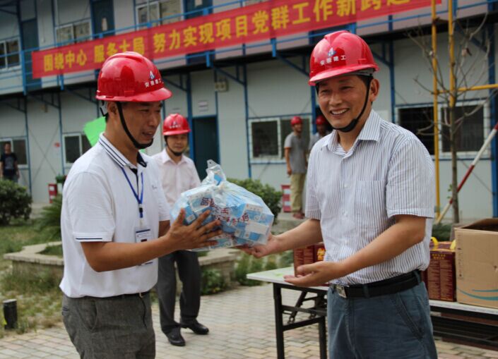牛曙东副书记一行还为奋战在建科院项目的一线职工送上了毛巾、绿豆、白糖、凉茶、风油精、十滴水等防暑降温用品和药品,并叮嘱高温季节要合理安排作息时间,确保施工现场作业安全,防止出现高温中暑情况,要站在安全发展的高度,切实将防暑降温工作安排好、落实好,保障职工安全度夏。
