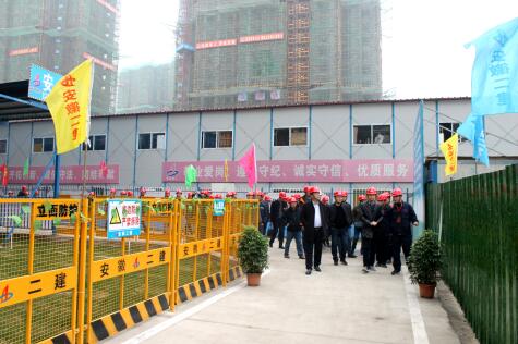12月1日,安徽二建阜阳大学城•红街项目、安建枫林源筑项目施工现场举行了在建项目现场观摩会。活动旨在深入推进公司基础管理深化年活动,充分发挥基层党组织推动发展、服务职工、凝聚人心、促进和谐作用,使党建工作更好地融入企业的生产经营管理之中,进一步提高施工现场文明生产施工和安全质量管理水平。公司党委书记刘贤奇、副总经理叶和永出席,所属分公司党支部书记、分管安全生产副经理及安全科、综合办负责人、全体自营项目项目经理、安全负责人、项目党支部负责人参加观摩会。