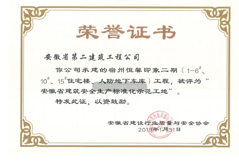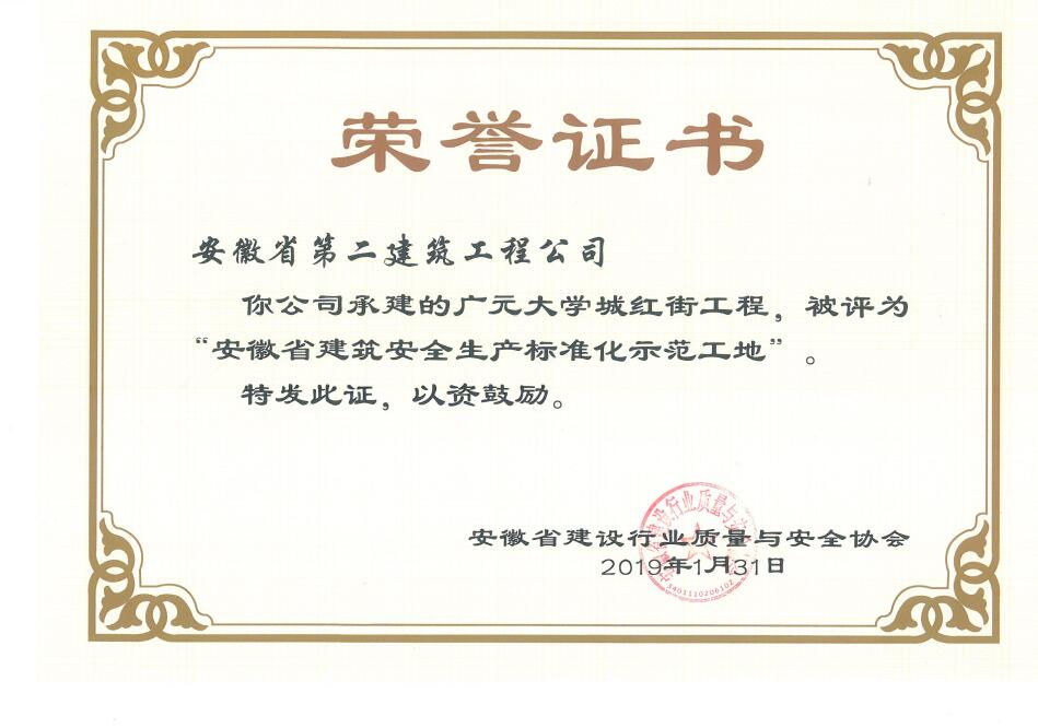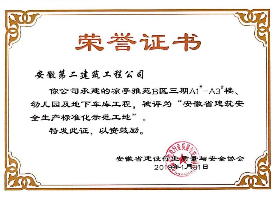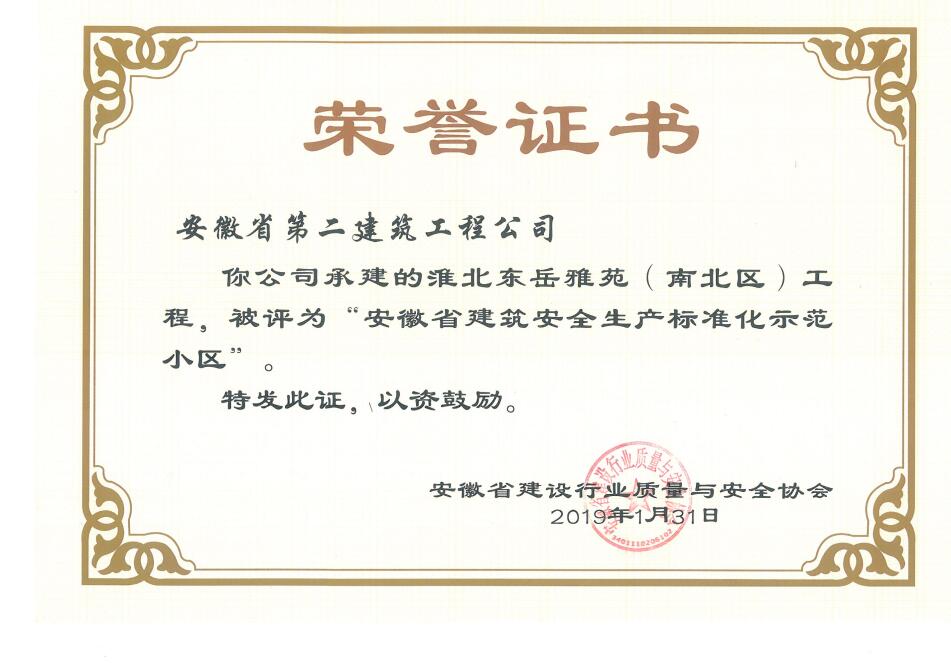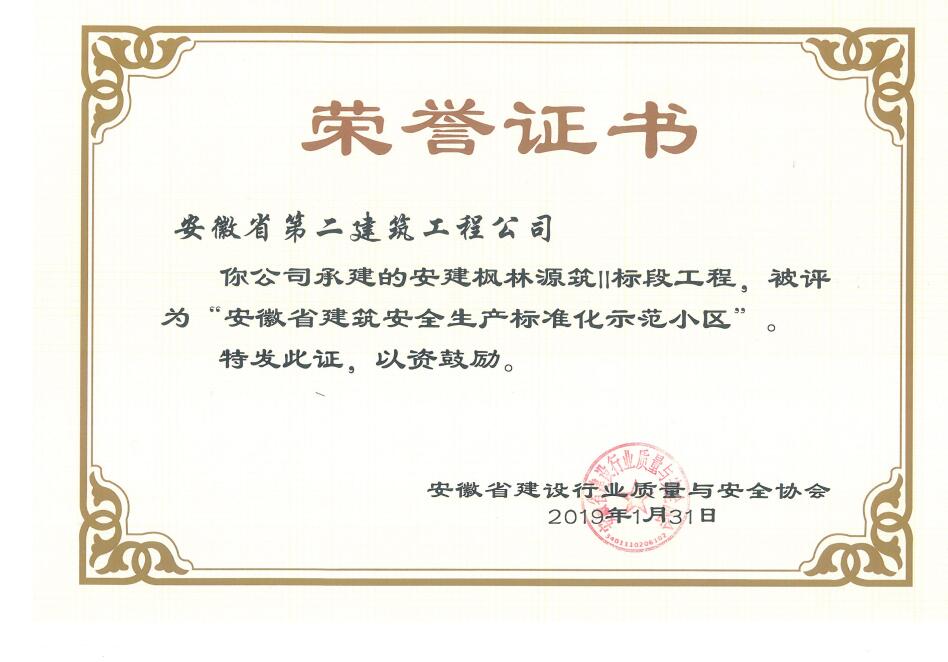近日,从安徽省建设行业质量与安全协会获悉,安徽二建承建的肥西凉亭雅苑、阜阳枫林源筑、阜阳广元大学城、宿州恒馨印象、淮北东岳雅苑5个项目获得2018年度“安徽省建筑施工安全生产标准化示范工地”称号,为公司再添荣誉。