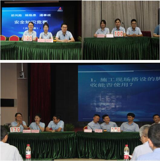 在2019年全国第18个“安全生产月”期间,为更好地促进集团公司广大职工深入学习掌握行业安全生产相关法律法规及标准规范,认真贯彻落实“安全第一、预防为主、综合治理”方针,强化“安全为天  生命至上”理念,6月12日下午,在集团公司三楼会议室隆重举行“防风险、除隐患、遏事故”主题安全知识竞赛活动,共25支代表队参赛公司安全总监曹建,总经理助理、工会副主席蒯家江带队参赛。