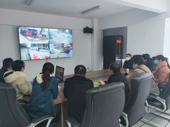 会上,卫邦齐一行听取了二建远程监控指挥中心的建设历程,了解了二建监控系统结构、监控设备组成等情况。随后,安全管理部远程调取了各工地视频画面、操作塔吊摄像头运动演示;在监控中心通过系统远程指挥淮北国金华府项目安全员,利用执法仪对工地冲洗台、人防电梯、材料堆放处、塔吊、框架内部等区域做日常安全巡检工作。