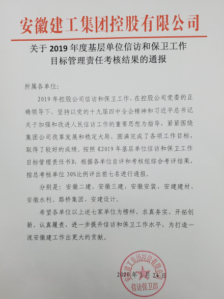 安徽二建信访保卫工作在公司党委的正确领导下,圆满完成了2019年度的各项工作任务。在集团信访保卫部组织的《2019年基层单位信访和保卫工作目标管理责任书》考核评比中荣获第一名。