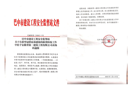 2020年5月6日,四川巴中市安全监督站对安徽二建承建的半山逸城二期项目在新冠肺炎防疫疫情防控和有序复工复产工作进行通报表扬。