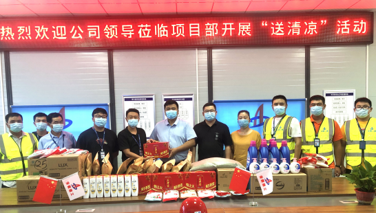 为做好高温季节防暑降温工作,切实维护职工安全健康权益,8月13日上午,公司副总经理费勤波,工会副主席、女工主任王俊一行赴二分公司肥东县人民医院公共卫生综合楼项目开展2021年夏日“送清凉”活动,对项目工作进行指导,为坚守在一线工作岗位的职工送去防暑降温慰问品,给项目部带来了一缕清凉。