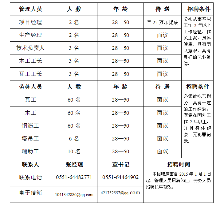 因安徽省第二建筑工程公司承建的阿尔及利亚阿尔及尔654套住房项目及太把萨大学城工程项目的需要,现公开面向社会招聘项目管理人员及劳务工人,具体招聘事项见附表。