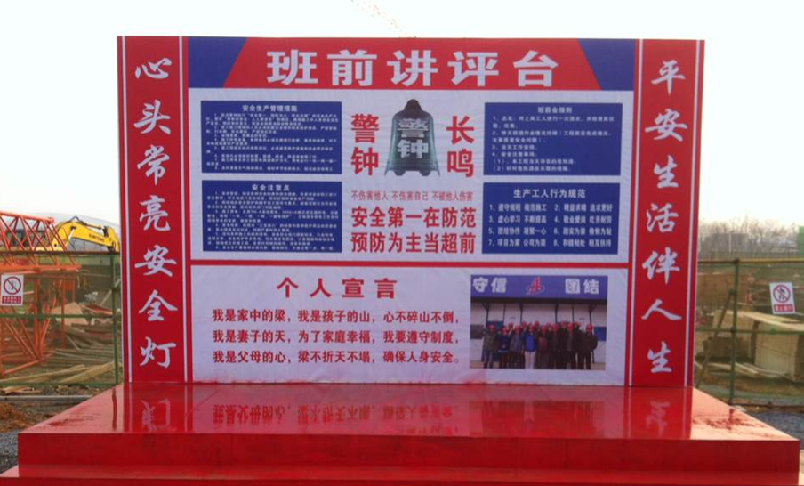 在项目施工现场,坐落着一块长5米、宽2米的宣传板,上方写着“班前讲评台”,左右各写“心头常亮安全灯”“平安生活伴人生”的字样。这是三分公司宿松安建龙溪山庄项目部工地开展的施工前安全教育活动。