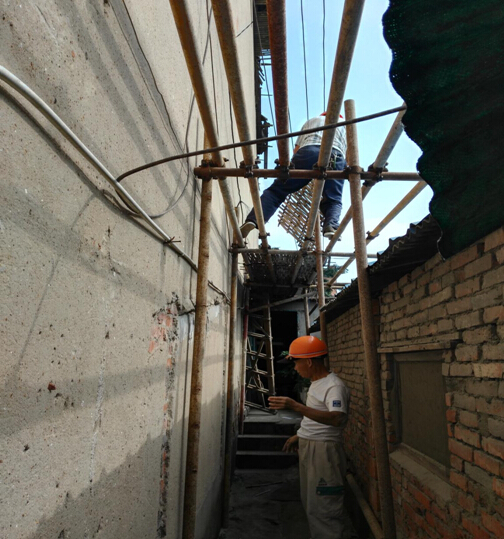 近日,公司后勤综合服务部在对公司老旧房屋进行日常巡查时发现,原四分公司生活基地大礼堂山墙檐口出现间断式沉降断裂。经检查,此处的问题是由墙体自重及屋面木质结构自然腐朽所导致的。山墙脚即是住户出入通道,随时有坠落伤人的安全隐患。鉴于大礼堂层高十几米,无法实施维修处理,我部第一时间向领导汇报后,及时拿出整顿方案,顶着烈日高温,立即沿山墙搭建一条十几米长的钢管架安全通道,排除了隐患,确保居民出入平安。