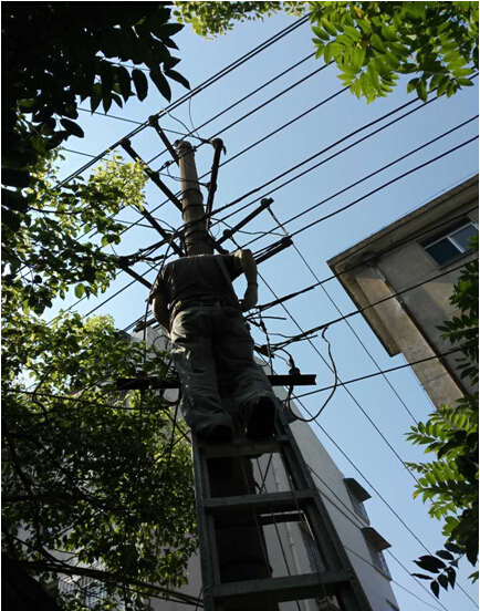 723,原二公司生活基地由于供电线路严重老化,发生线路着火断电事故,后勤综合服务部接到险情报告后,立即组织抢修队伍奔赴现场,维修人员不惧高温酷暑,顶着烈日,经过几个小时的高空作业,及时恢复了供电。
